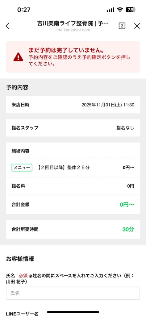 お名前、カナ、アドレス、性別、電話番号、生年月日、初回来店かどうかを入力し一番下の緑色の「予約確定」をタップ